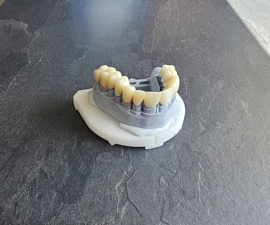 - Ugradnja trajnog mosta: Nakon izrade, trajni most se cementira na pripremljene nosače.